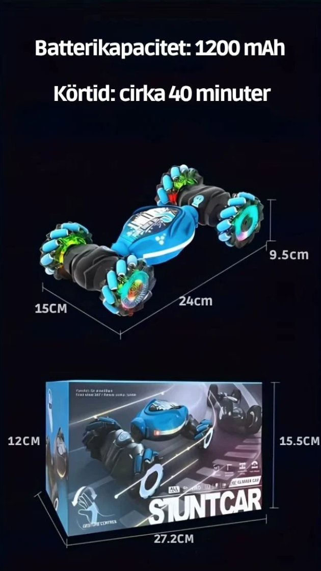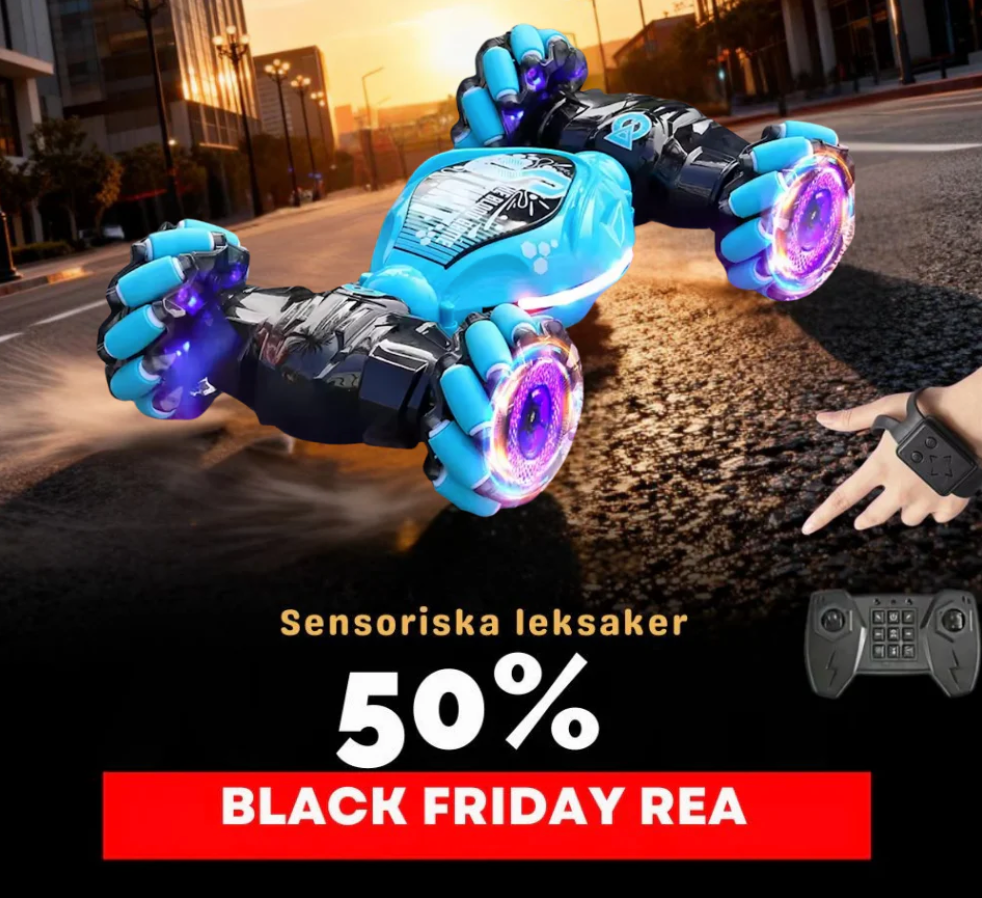 Allt styrs med barnets egna rörelser. Den smidiga sensorn runt handleden gör att bilen reagerar direkt på gester i luften – en vinkning, en handvridning eller en bestämd rörelse får bilen att köra framåt, svänga, snurra eller byta riktning helt utan knappar. För barnet känns det som att ha en superkraft: bilen följer deras minsta gest och ser helt magiskt kontrollerad ut inför vänner och familj.